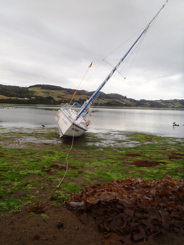 Ponoči sva se zasidrala v zalivu otoka Quehui in si ga zjutraj med sprehodom ogledala. V teh dneh, v času mlaja, je razlika med plimo in oseko med temi otoki preko 6 metrov in temu primerni so tudi tokovi v prelivih med otoki, ko se včasih proti toku mukoma premikaš naprej, drugilč pa spet s tokom drviš mimo otokov, da komajda sproti slediš položaju barke na zemljevidu.
