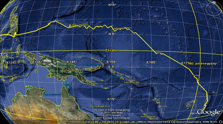 Trenutna pozicija: S 00.03; E 166.05; kurs 140; do Nauruja je še 58 milj.