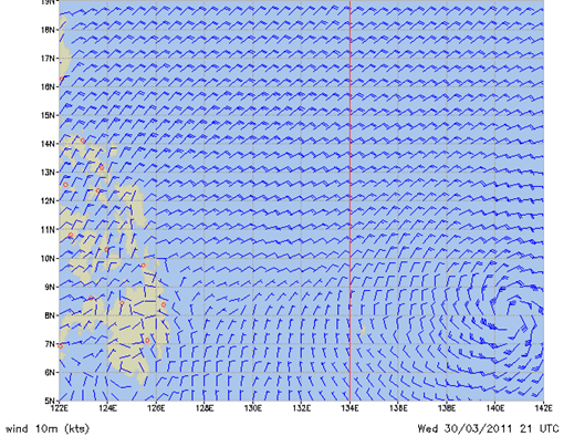 Konec zime bi po vremenskih statistikah moral pomeniti tudi konec zimskega monsuna in s tem bi se moralo nekoliko umiriti tudi morje vzhodno od Filipinov. Sredenjeročne vremenske napovedi sedaj zares obetajo, da bo SV veter prihodnji teden začel slabeti in z njim tudi (za našo pot) nasprotni valovi.