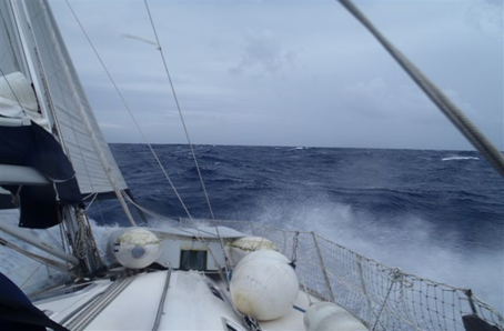 Včeraj je narava pokazala kako nepredvidljiva in neukrotljiva zna biti. Ponoči so temni nevihtni oblaki prinesli s seboj tudi močne sunke vetra, ki so dosegali jakost do 50 vozlov z vzhoda-jugovzhoda. Zjutraj je močan veter čisto ponehal ostali pa so ogromni oceanski valovi. Mornarja sta brezveterje izkoristila za krpanje glavnega in viharnega jadra. Vreme je še vedno bolj kislo in tudi vremenska napoved ni nič boljša. Vetra pa je dovolj za normalno jadranje, le smer ni prava.