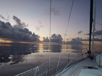 Trenutno 5-8 vzl. vzhodnika in jadrava z 2-5 vozli hitrosti. Jasno, plohe v okolici. Dela se lepo jutro. Včeraj čez dan sva imela deset ur popolno brezvetrje. Jadrava kolikor se da, pa čeprav včasih zelo počasi, ker je naslednja pumpa zelo daleč.
