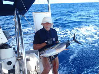 dni bolniške s strogim mirovanjem, a jo krši, da krmar včasih lahko ujame kakšno uro spanja. Tudi ladijski kuhar se je danes že toliko opomogel, da sva imela s Klemenom spet en topel obrok. Na jedilniku je bila seveda tuna, ki jo je Klemen ujel pred dnevi in katere zrezki so naloženi v hladilniku. Vetra imava vseskozi dovolj, zato vetrni generator naredi dovolj elektrike, da so akumulatorji vseskozi polni.