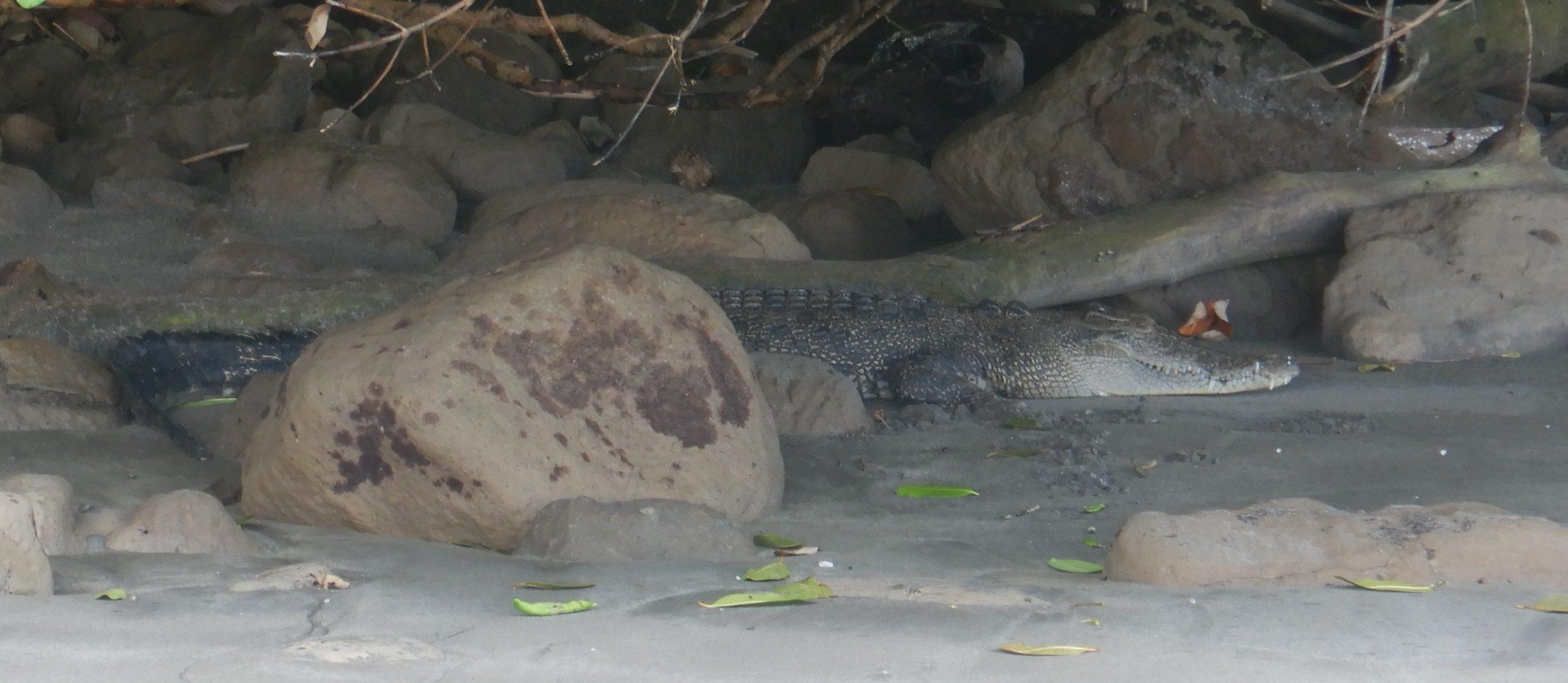 V prvem zalivu nismo našli krokodila in tudi v drugem zalivu na obali ni bilo nobenega. Po pol ure sem že mislil, da bo podobno kot pred dvema letoma na Arktiki, kjer so vsi svarili pred severnimi medvedi, mi pa dolgo nismo uspeli videti nobenega. A vodič je bil vztrajen in smo nadaljevali pot še v tretji zaliv in tam smo končno videli krokodila, ki je ležal med skalami na obali. Vodič je povedal, da so krokodili tukaj lepših barv, ker živijo v bolj čisti vodi. Ali je krokodil spal ali ne si nisem upal iti pogledati. Raje sem ostal v čolnu nekaj metrov od obale in že tako se mi je zdelo, da smo zelo blizu.