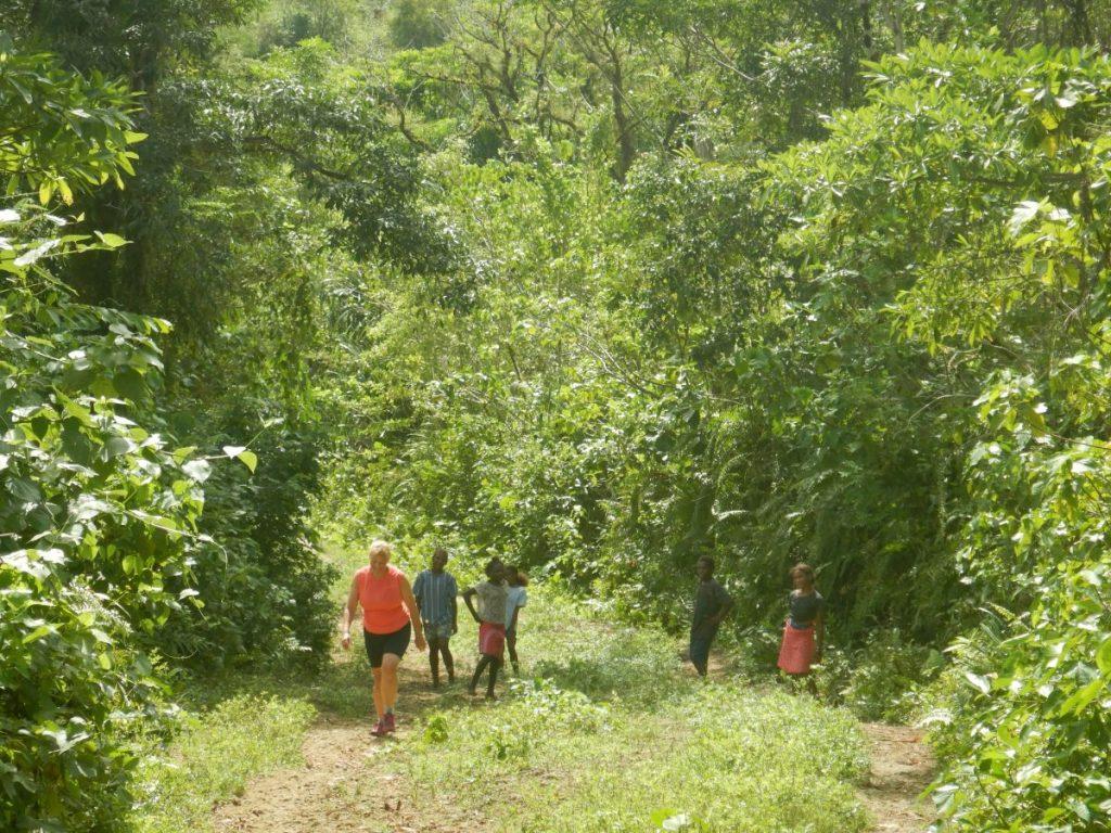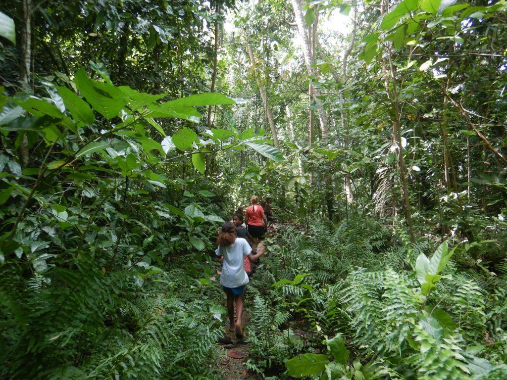 Z Zlato sva se po opravljenih protokolarnih obveznostih in nakupu spominkov odpravila najprej na nekaj kilometrski sprehod skozi džunglo na hrib do velikega jezera, ki leži v kraterju ugaslega vulkana. Voda iz jezera skozi hrib pronica tudi do vasi in iz izvirov vaščanom zagotavlja pitno vodo. Vseskozi sva na gozdnih poteh imela glasno družbo živahnih malih vodičev. Poglavar je rekel, da moramo biti previdni in da se v jezeru ne smemo kopati, ker v njem živi krokodil. Nisem prepričan, da to ni le pravljica za otroke, da se ne bi preveč potepali po otoku.
